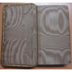 Bello ejemplar en plena piel marron claro con adorno metalico en la cubierta y encuadernado con el interior a modo de cartera de bolsillo con lugar en las cotracubiertas para guardar estampas, tarjetas, documentos y/o papel moneda, forarrado en interior en elegante tela de raso y cinta separadora en seda blanca. Cortes dorados y buen papel, bien impreso y muy decorado con letras iniciales ...