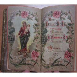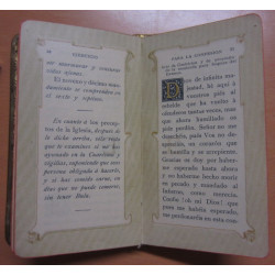 Bello ejemplar en plena piel marron claro con adorno metalico en la cubierta y encuadernado con el interior a modo de cartera de bolsillo con lugar en las cotracubiertas para guardar estampas, tarjetas, documentos y/o papel moneda, forarrado en interior en elegante tela de raso y cinta separadora en seda blanca. Cortes dorados y buen papel, bien impreso y muy decorado con letras iniciales decoradas al inicio de sección o capitulo y dos bellas ilustraciones en las contraguaradas de portada. Contiene: Las oraciones del día - Los ejercicios de la confesión y la comunión - La Santa Misa por J. A. De La Valle - La Semana Santa entera y Muchas otras oraciones. 228págs + Índice