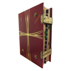Plena piel decorada con tachuelas en cubiertas delantera y trasera y cierres de laton en el corte de apertura Cortes corados separadores frontales en color por secciones y 8 cintas separadoras en seda de color como puentos de lectura. A doble columna, con titulos e inicios en rojo. Calendarios, ritos tablas, liturgía, etc. Integr...